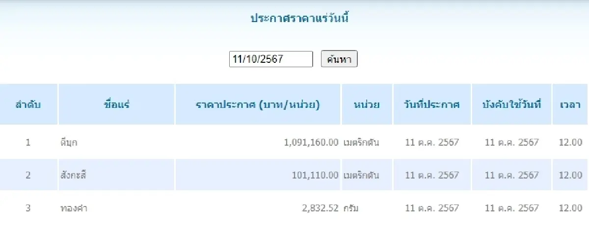 ประกาศราคาแร่ (กรมอุตสาหกรรมพื้นฐานและการเหมืองแร่) เรื่อง กำหนดราคาเพื่อใช้เป็นเกณฑ์ประเมิน สำหรับเรียกเก็บค่าภาคหลวงแร่ ประจำวันที่ 11 ตุลาคม 2567