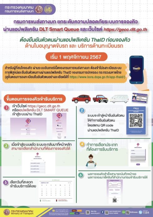 ขั้นตอนการจองคิวผ่านแอปพลิเคชัน DLT Smart Queue และเว็บไซต์ https://gecc.dlt.go.th/ ที่ต้องยืนยันตัวตนผ่าน ThaID