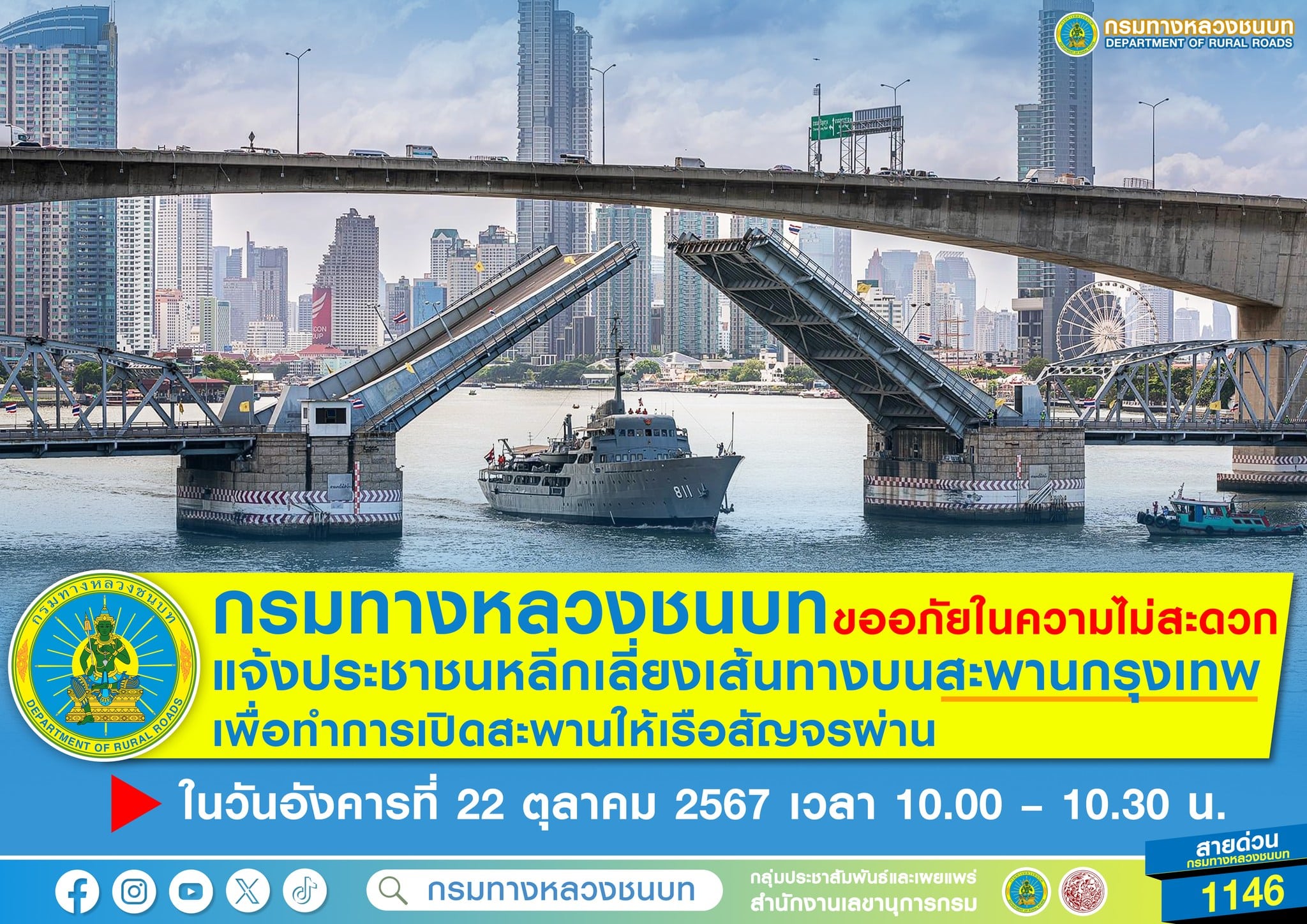 กรมทางหลวงชนบท กระทรวงคมนาคม แจ้งปิดสะพานกรุงเทพ เพื่อให้เรือสัญจรผ่าน ตั้งแต่เวลา 10.00 – 10.30 น. ของวันที่ 22 ตุลาคม 2567 แนะประชาชนโปรดเลี่ยงเส้นทาง