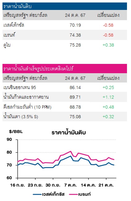 วันที่ 25 ตุลาคม 2567 หน่วยวิเคราะห์สถานการณ์ราคาน้ำมัน บมจ.ไทยออยล์ ระบุว่า ปัจจัยที่ส่งผลกระทบกับราคามีดังนี้ ราคาน้ำมันดิบปรับลดลง หลังมีรายงานว่าสหรัฐและอิสราเอลพยายามผลักดันให้มีการเจรจาข้อตกลงหยุดยิงในฉนวนกาซาอีกครั้ง โดยนายแอนโทนี บลิงเคน รัฐมนตรีต่างประเทศสหรัฐเดินทางไปยังตะวันออกกลางในสัปดาห์นี้