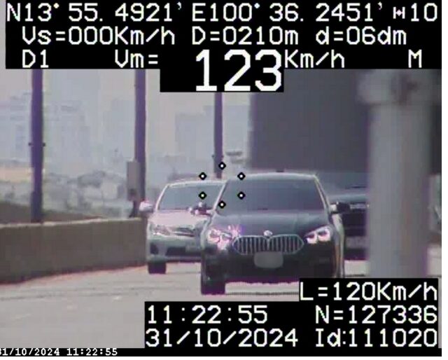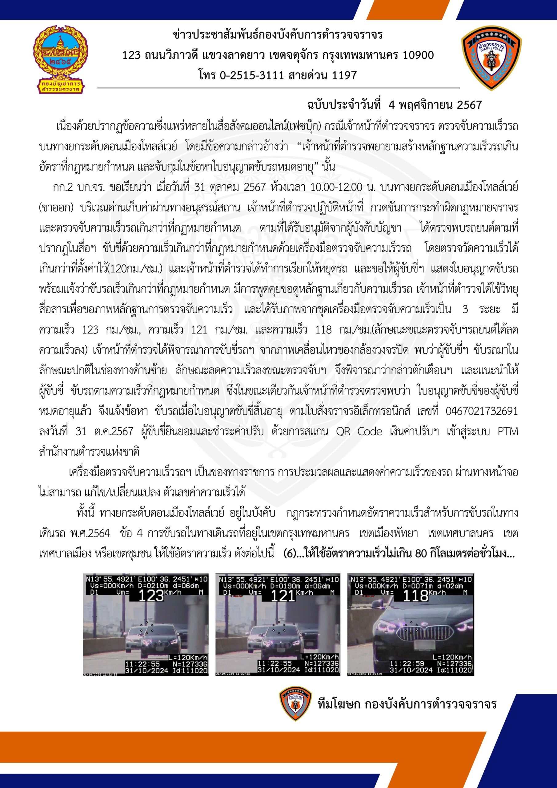 กก.2 บก.จร. ขอเรียนว่า เมื่อวันที่ 31 ตุลาคม 2567 ห้วงเวลา 10.00-12.00 น. บนทางยกระดับดอนเมืองโทลล์เวย์ (ขาออก) บริเวณด่านเก็บค่าผ่านทางอนุสรณ์สถาน เจ้าหน้าที่ตำรวจปฏิบัติหน้าที่ กวดขันการกระทำผิดกฎหมายจราจร และตรวจจับความเร็วรถเกินกว่าที่กฎหมายกำหนด ตามที่ได้รับอนุมัติจากผู้บังคับบัญชา ได้ตรวจพบรถยนต์ตามที่ปรากฏในสื่อ ขับขี่ด้วยความเร็วเกินกว่าที่กฎหมายกำหนด ด้วยเครื่องมือตรวจจับความเร็วรถ