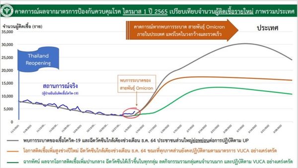 ปลัดกระทรวงสาธารณสุข กล่าวต่อว่า ขณะนี้มีการระบาดเชื้อ"โอมิครอน" เข้ามาในประเทศไทย ทั้งนี้เชื้อดังกล่าวมีอาการไม่รุนแรง และผู้ที่ติดเชื้อโอมิครอน สามารถป้องกันเชื้อเดลตาด้วย แม้โควิดสายพันธุ์โอมิครอนมีอัตราการเสียชีวิตต่ำ แต่ฐานติดเชื้อมีมาก ก็จะมีผู้เสียชีวิตเพิ่มขึ้น มีการติดเชื้อเพิ่มขึ้นอย่างรวดเร็ว ผู้เสียชีวิต ยังอยู่ในกลุ่ม ผู้สูงอายุ ผู้ป่วยโรคเรื้อรัง ที่ส่วนใหญ่ไม่ได้รับวัคซีน การแพร่ระบาดยังเป็นไปตามการคาดการณ์ไว้ในฉากทัศน์ของกระทรวงสาธารณสุข ยังเป็นไปตามเส้นสีเทา จำเป็นต้องควบคุมให้รวดเร็วมากขึ้น ดังนั้นขอพี่น้องประชาชนได้ตื่นตัว สถานการณ์ขณะนี้ การแพร่ระบาดสธ.ยังสามารถควบคุมได้ดี จำนวนผู้ป่วยเสียชีวิตลดลง แต่มีการติดเชื้อรวดเร็วพุ่งขึ้น