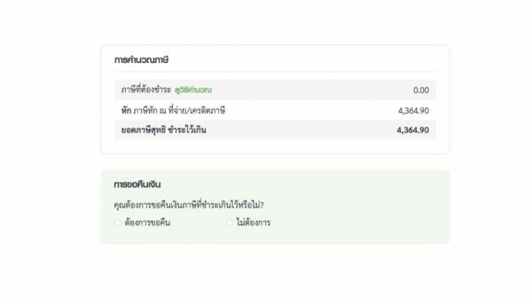 ตรวจสอบข้อมูลเงินได้และรายการลดหย่อนทั้งหมด ระบบจะคำนวณการเสียภาษีมาให้ หากชำระภาษีไปแล้ว ก็จะมียอดที่ชำระไว้เกินปรากฏ