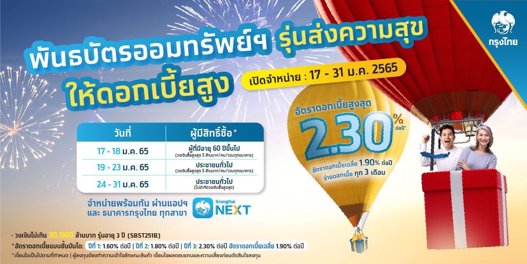 เช็กเลย! แบงก์กรุงไทยเปิดจำหน่ายพันธบัตรออมทรัพย์ฯ อัตราดอกเบี้ยสูงสุด 2.30% ต่อปี วันที่ 17-31 มกราคม 2565