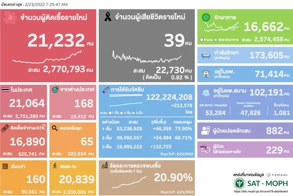 วันที่ 23 ก.พ. 2565 ศูนย์บริหารสถานการณ์การแพร่ระบาดของโรคติดเชื้อไวรัสโคโรนา 2019 (โควิด-19) หรือ ศบค. และกระทรวงสาธารณสุข รายงานสถานการณ์โควิด-19 ในประเทศไทย มีผู้ติดเชื้อ 21,232 รายใหม่ ยอดการตรวจ ATK พบติดเชื้อเข้าข่าย หรือผลเป็นบวกอีก 16,890 ราย ส่วนผู้เสียชีวิตเพิ่มขึ้นเป็น 39 ศพ ซึ่งทั้ง 3 ยอด สูงที่สุดตั้งแต่หลังปีใหม่ 2565 เป็นต้นมา