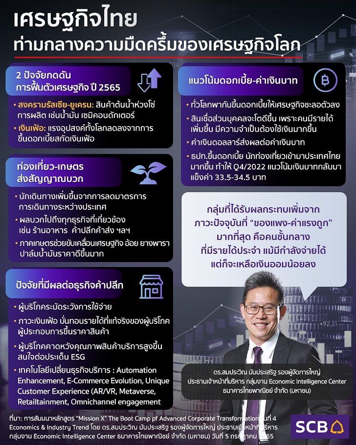 หลังจากที่ฟันฝ่ามรสุมวิกฤตโควิดกว่า 2 ปี เศรษฐกิจไทยในวันนี้ที่เริ่มดีขึ้นจากการเปิดประเทศและขับเคลื่อนธุรกิจท่องเที่ยว กลับต้องเผชิญกับเงาทะมึนจากปัจจัยความเสี่ยงเศรษฐกิจโลก ไม่ว่าจะเป็นสงครามรัสเซีย-ยูเครน ปัญหาเงินเฟ้อ การปรับขึ้นดอกเบี้ย ฯลฯ
