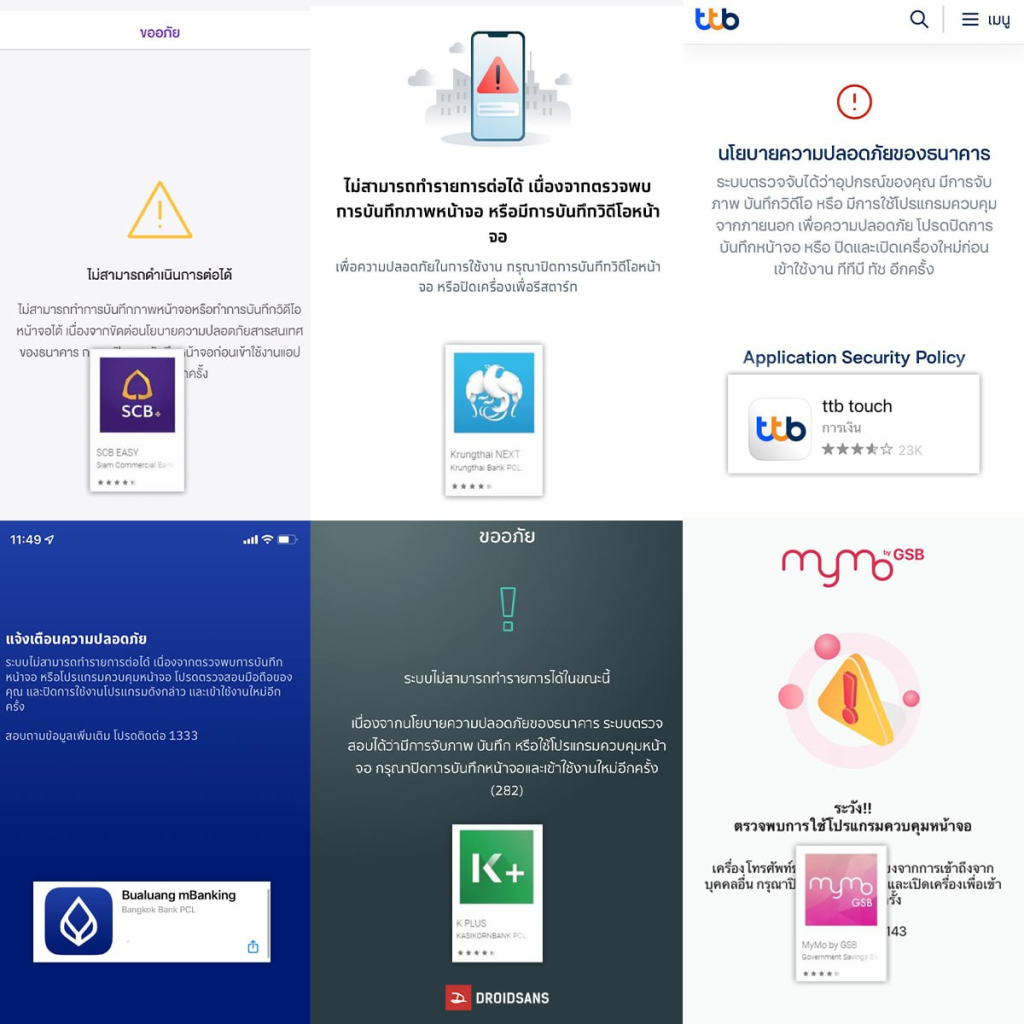 แอปธนาคาร หลายแห่ง เริ่มเร่งใช้มาตรากรป้องกัน มิจฉาชีพ หลอก ดูดเงิน โดยอัปเดตระบบใหม่ เป็นระบบป้องกันการแอบดู / แคป /อัดวิดีโอหน้าจอแสดงผลของ โทรศัพท์มือถือ โดยสามารถป้องการทำธุรกรรมทางการเงินของเราได้ปลอดภัยมากขึ้น