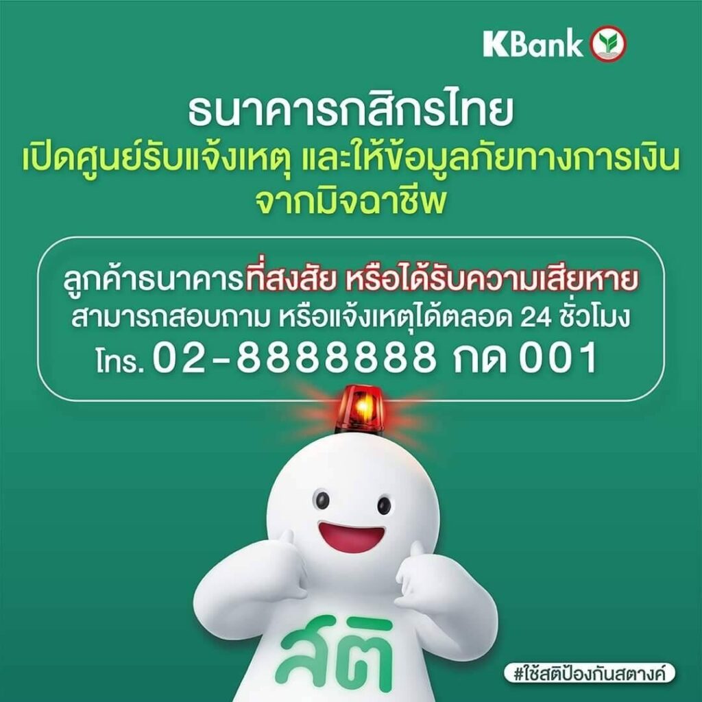 ธนาคารกสิกรไทย จัดตั้งศูนย์รับแจ้งเหตุ และให้ข้อมูลภัยทางการเงินจากมิจฉาชีพได้ตลอด 24 ชั่วโมง หากพบเหตุบุคคลแอบอ้างเป็นธนาคารติดต่อมา หรือได้รับความเสียหายจากมิจฉาชีพ สอบถาม และแจ้งเหตุได้ทันทีที่ โทร. 02-8888888 กด 001 รู้ทันกลโกงจากมิจฉาชีพได้ที่ https://kbank.co/3xzhEB3