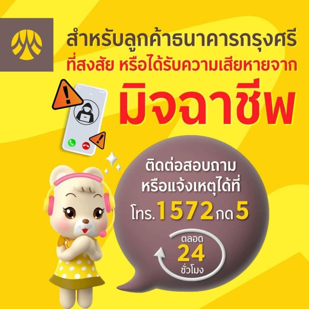 ขณะที่ ธนาคารกรุงศรี มีบริการแจ้งเหตุมิจฉาชีพหลอก ถ้าสงสัยว่ากำลังถูกหลอก หรือได้รับความเสียหาย ติดต่อ 1572 กด 5 เราพร้อมดูแลตลอด 24 ชั่วโมง
