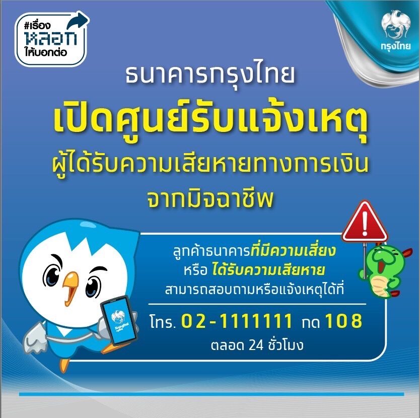 ธนาคารกรุงไทย เปิดศูนย์รับแจ้งเหตุผู้ได้รับความเสียหายทางการเงินจากมิจฉาชีพ ลูกค้าธนาคาร ที่มีความเสี่ยงหรือ ได้รับความเสียหาย สามารถสอบถามหรือแจ้งเหตุได้ตลอด 24 ชั่วโมงที่ โทร. 02-1111111 กด 108