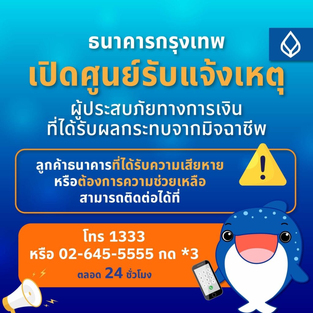 ลูกค้าธนาคารที่ได้รับความเสียหายหรือต้องการความช่วยเหลือ สามารถติดต่อได้ที่ โทร 1333 หรือ 02-645-5555 กด *3 ตลอด 24 ชั่วโมง