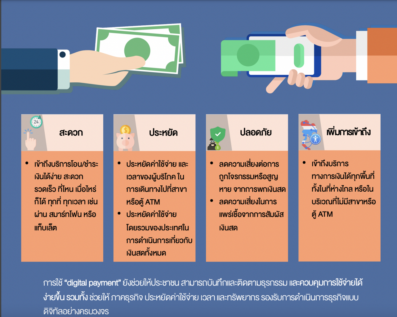 พร้อมๆ กับแนวทาง ธปท. ที่มีนโยบายลดการใช้เงินสด และส่งเสริม Digital Payment อย่างจริงจัง กำหนดเป้าหมายภายใน 3 ปี ลดการใช้ “เงินสด” อัตราเร่งเป็น 2 เท่า และเพิ่มการใช้ “Digital Payment” หรือการชำระเงินแบบดิจิทัลเป็น 2.5 เท่า โดยอยากเห็นการใช้จ่ายในรูปแบบ Digital Payment ราว 800 ครั้งต่อคนต่อปี ภายในปี 2567 ให้ได้