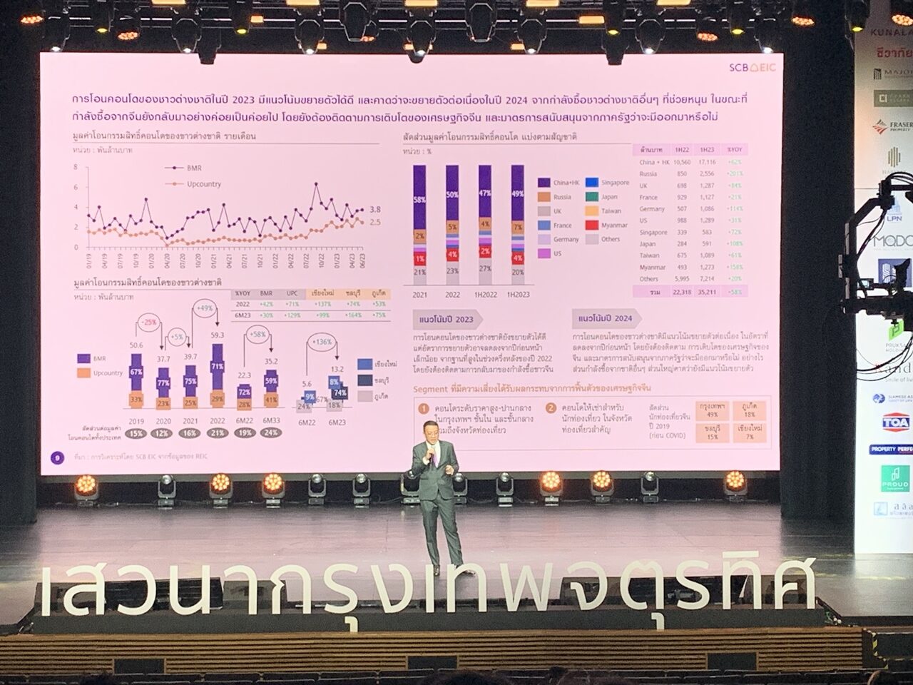 เมื่อวันที่ 21 กันยายน ที่สยามสแควร์วัน ในงานเสวนาจัด 9 ทัพรับศึก 10 ทิศสู้วิกฤตอสังหา นายเชษฐวัฒก์ ทรงประเสริฐ นักวิเคราะห์ศูนย์วิจัยเศรษฐกิจและธุรกิจ (EIC) ธนาคารไทยพาณิชย์ จำกัด (มหาชน) กล่าวถึงภาพรวมตลาดอสังหาริมทรัพย์ว่า แนวโน้มตลาดที่อยู่อาศัยกรุงเทพฯและปริมณฑลปี 2567 ฟื้นตัวได้มากขึ้น จากหลายปัจจัยสนับสนุน ไม่ว่าภาวะเศรษฐกิจทำให้กำลังซื้อในประเทศฟื้นตัวมากขึ้น กำลังซื้อต่างชาติยังดีต่อเนื่อง แต่ปัจจัยกดดันยังคงมีมากกว่าทั้งภาวะหนี้ครัวเรือนที่อยู่ระดับสูง ภาระค่าใช้จ่าย ดอกเบี้ย ต้นทุนก่อสร้าง ค่าแรงที่จะปรับขึ้น ส่งผลให้การฟื้นตัวของตลาดเป็นไปอย่างค่อยเป็นค่อยไป