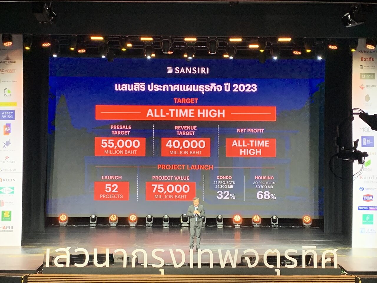 นายอุทัย อุทัยแสงสุข ประธานผู้บริหารสายงานปฏิบัติการบริษัท แสนสิริ จำกัด (มหาชน) กล่าวว่า ในช่วงไตรมาส 3 เป็นช่วงจังหวะเศรษฐกิจยังไม่ค่อยดี จึงต้องจัดโปรโมชั่นกระตุ้นยอดขายมากขึ้น และอีก 3 เดือนนี้เชื่อว่าจะดีขึ้น หลังรัฐบาลมีนโยบายกระตุ้นเศรษฐกิจและการท่องเที่ยวออกมาโดยเชื่อว่าจีดีพีปีนี้ขยายตัวมากกว่า 3% ส่งผลมายังตลาดอสังหาฯดีขึ้นด้วย เพราะมีความสัมพันธ์กับภาวะเศรษฐกิจและการท่องเที่ยว ที่จะทำให้มีลูกค้าต่างชาติมาซื้ออสังหาฯมากขึ้น และจากความชัดเจนดังกล่าวทำให้แสนสิริมีแผนเปิดโครงการใหม่มากขึ้นในปี 2567 จากปีนี้เปิด 52 โครงการ มูลค่า 75,000 ล้านบาท ตั้งเป้ายอดขายสูงถึง 55,000 ล้านบาท และรายได้ 40,000 ล้านบาท จะเห็นได้ว่าปีนี้กลับมาทำคอนคฯมากขึ้นถึง 22 โครงการ มูลค่า 24,300 ล้านบาท และแนวราบ 30 โครงการ มูลค่า 50,700 ล้านบาท