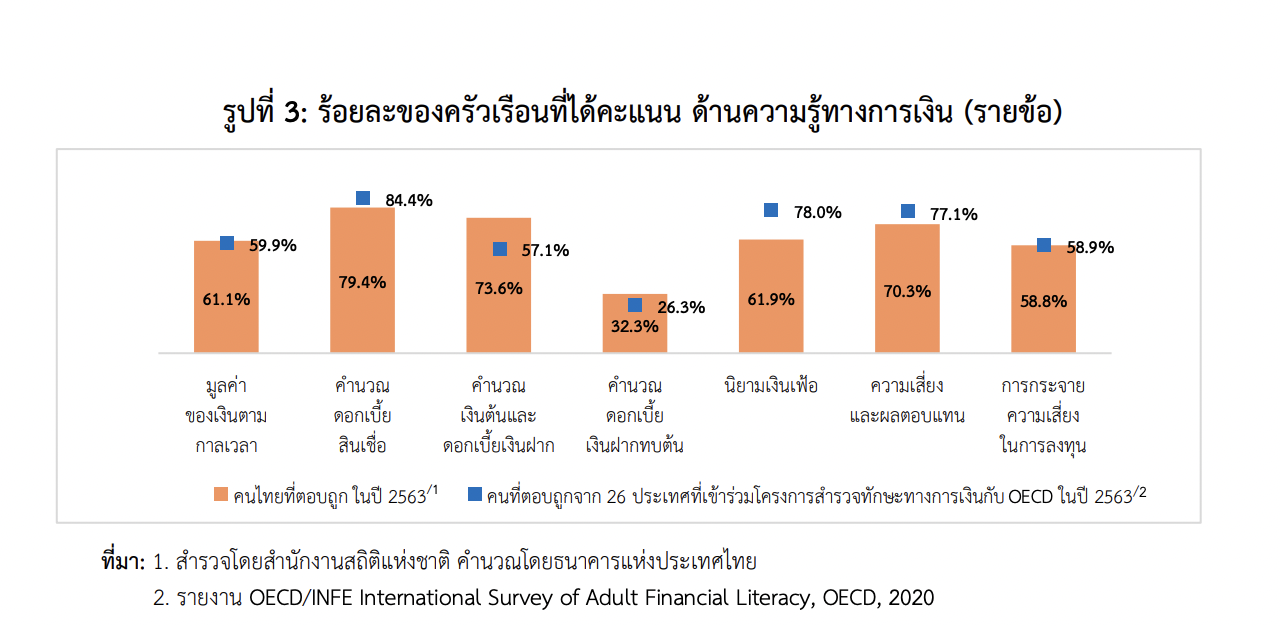 ทั้งนี้ จากภาพรวมการสำรวจระดับทักษะทางการเงินครั้งล่าสุดของไทยเมื่อปี 2020 พบว่าทักษะทางการเงินของคนไทยมีคะแนนเฉลี่ย 71% ซึ่งสูงกว่าค่าเฉลี่ยการสำรวจของกลุ่มประเทศ OECD ที่ 60.5%