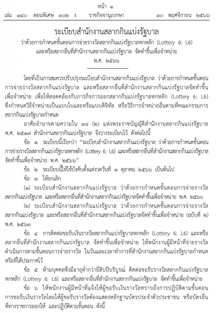 กฎหมายใหม่นี้เป็นการปรับปรุงระเบียบขั้นตอนการจ่ายรางวัลสลากกินแบ่งรัฐบาล และหรือสลากอื่นที่สํานักงานสลากกินแบ่งรัฐบาลจัดทําขึ้นเพื่อจําหน่าย เพื่อให้สอดคล้องกับภารกิจการออกสลากกินแบ่งรัฐบาลหกหลัก (Lottery 6: L6) ที่ออกมาเพิ่มในปีนี้ มาดูกันเลยว่า ขั้นตอนใหม่มีรายละเอียดยังไงบ้าง