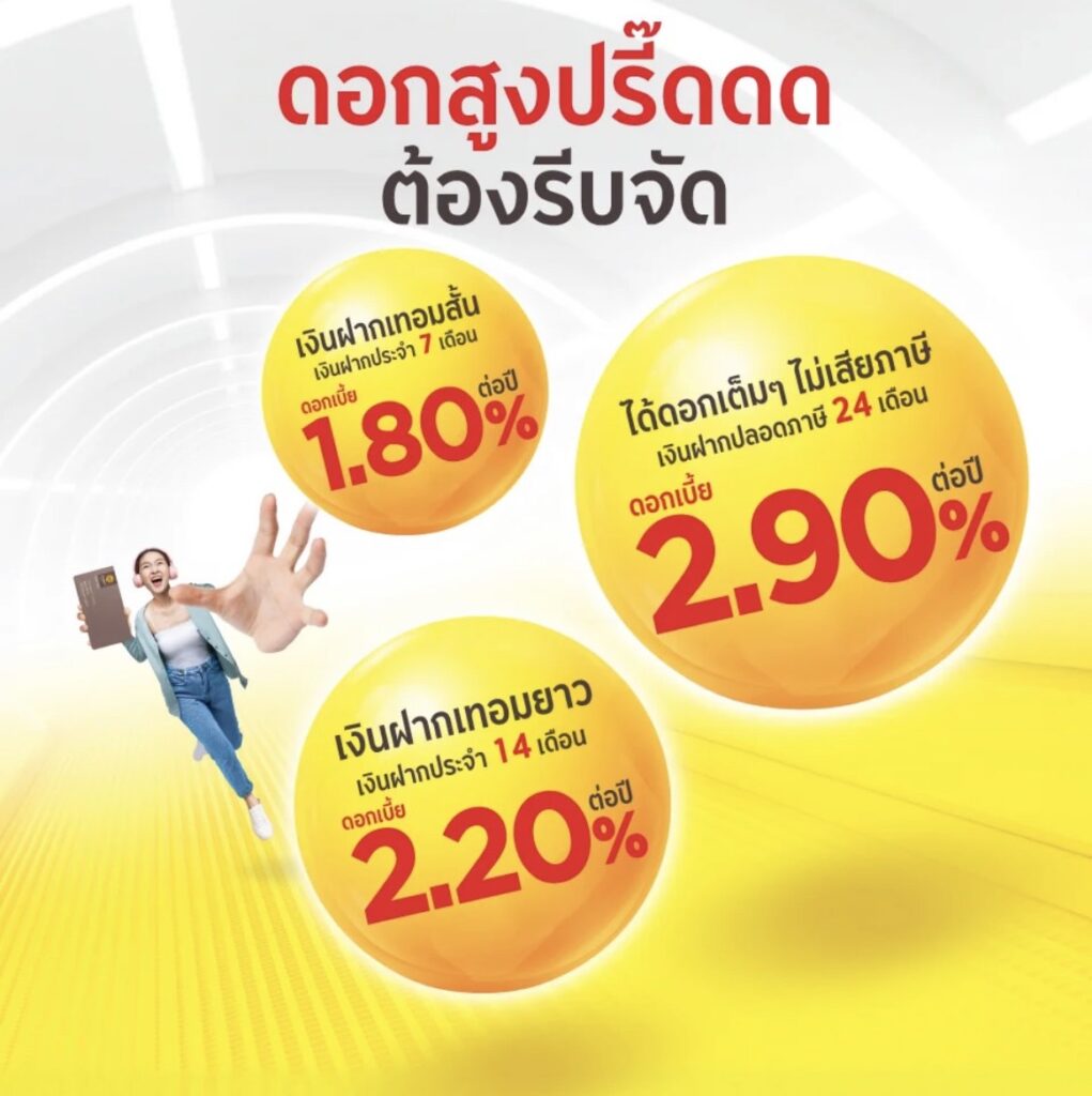 - เงินฝากเทอมยาว เงินฝากประจำ 14 เดือน ดอกเบี้ย 2.20% ต่อปี ฝากขั้นต่ำ 10,000 บาท รับดอกเบี้ยเมื่อครบกำหนดการฝาก