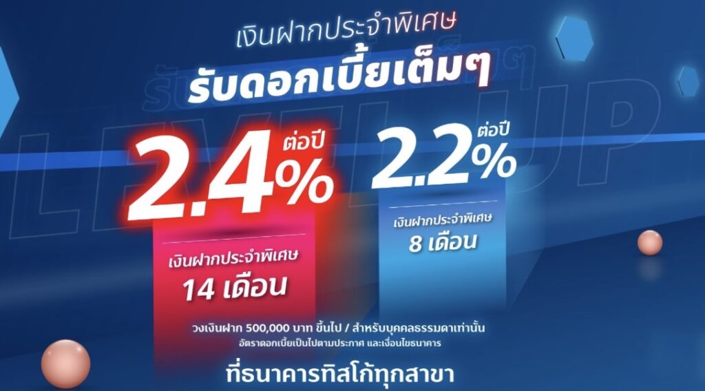 “ธนาคารทิสโก้” ออกเงินฝากประจำพิเศษ 14 เดือน รับอัตราดอกเบี้ย 2.4% ต่อปี และเงินฝากประจำพิเศษ 8 เดือน อัตราดอกเบี้ย 2.2% ต่อปี วงเงินฝาก 5 แสนบาทขึ้นไป (ไม่จำกัดจำนวนเงินฝากสูงสุด) สำหรับบุคคลธรรมดาเท่านั้น