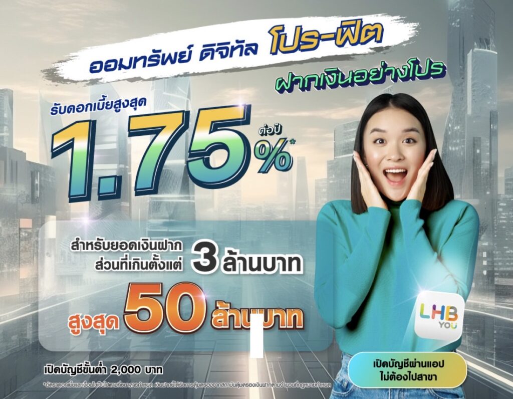 เงินฝาก ออมทรัพย์ ดิจิทัล โปร-ฟิต รับอัตราดอกเบี้ยสูงสุด 1.75% ต่อปี โดยรับดอกเบี้ยสูง 1.50% ต่อปี ตั้งแต่บาทแรก ถึง 3 ล้านบาท และรับดอกเบี้ยสูง 1.75% ต่อปี สำหรับเงินฝากส่วนที่เกิน 3 ล้านบาท ถึง 5 ล้านบาท เปิดบัญชีผ่านแอป LHB YOU ไม่ต้องไปสาขา เปิดบัญชีขั้นต่ำ 2,000 บาท