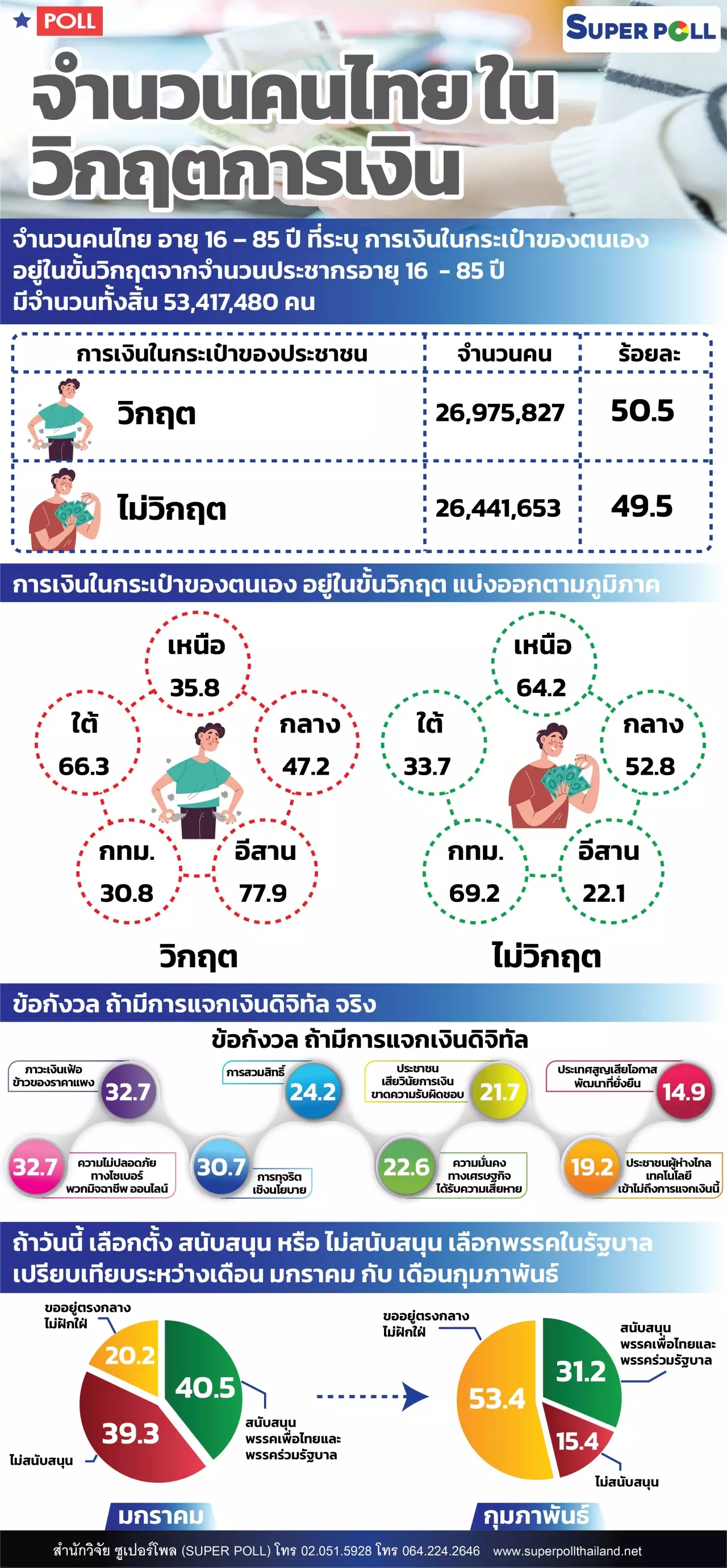 ผลสำรวจซูเปอร์โพล 1,146 ตัวอย่าง 50.5% ชี้ การเงินกระเป๋าตัวเองวิกฤติ ขณะที่ 49.5% บอก ไม่อยู่ในขั้นวิกฤติ แต่กังวลดิจิทัลวอลเล็ต ไม่ปลอดภัย เสี่ยงทุจริต สวมสิทธิ์ เผย คะแนนหนุนเพื่อไทยและพรรคร่วมรัฐบาลลดลง