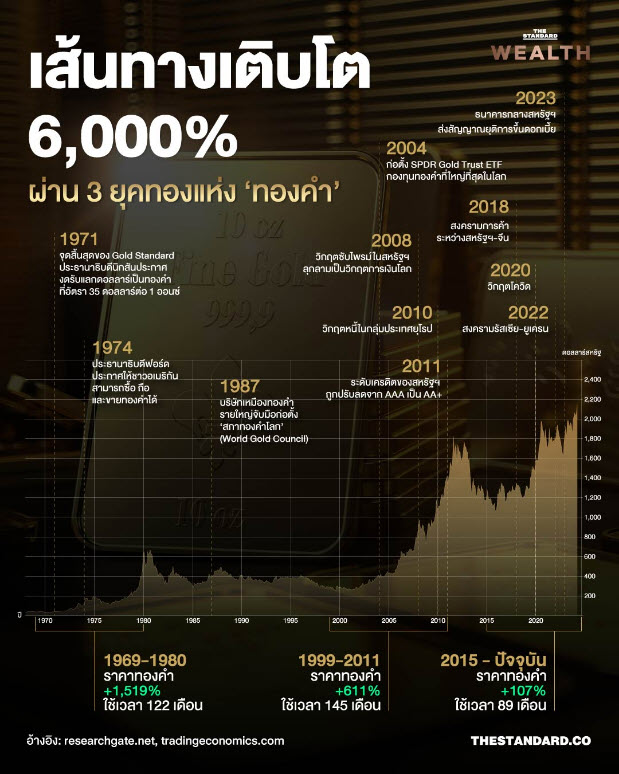 ที่มา : เส้นทางเติบโต 6,000% ผ่าน 3 ยุคทองแห่ง ‘ทองคำ’ – THE STANDARD