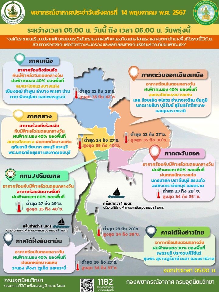 เมื่อวันที่ 14 พฤษภาคม กรมอุตุนิยมวิทยา พยากรณ์อากาศ 24 ชั่วโมงข้างหน้า บริเวณความกดอากาศสูง หรือมวลอากาศเย็นยังคงปกคลุมด้านตะวันออกของภาคตะวันออกเฉียงเหนือและทะเลจีนใต้ ส่งผลให้มีลมใต้และลมตะวันออกเฉียงใต้พัดนำความชื้นจากอ่าวไทยและทะเลจีนใต้เข้ามาปกคลุมอ่าวไทย ประเทศไทย และทะเลอันดามัน ในขณะที่ประเทศไทยตอนบนมีอากาศร้อนถึงร้อนจัด