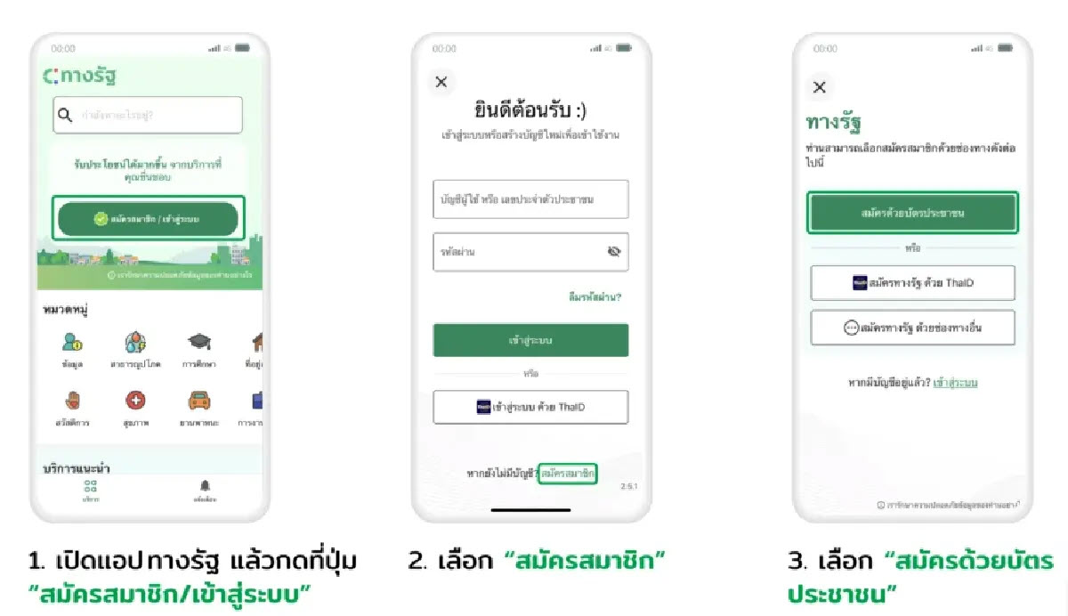 - ดาวน์โหลดแอปฯ ทางรัฐ เปิดแอปฯ ทางรัฐ แล้วเลือกสมัครสมาชิก