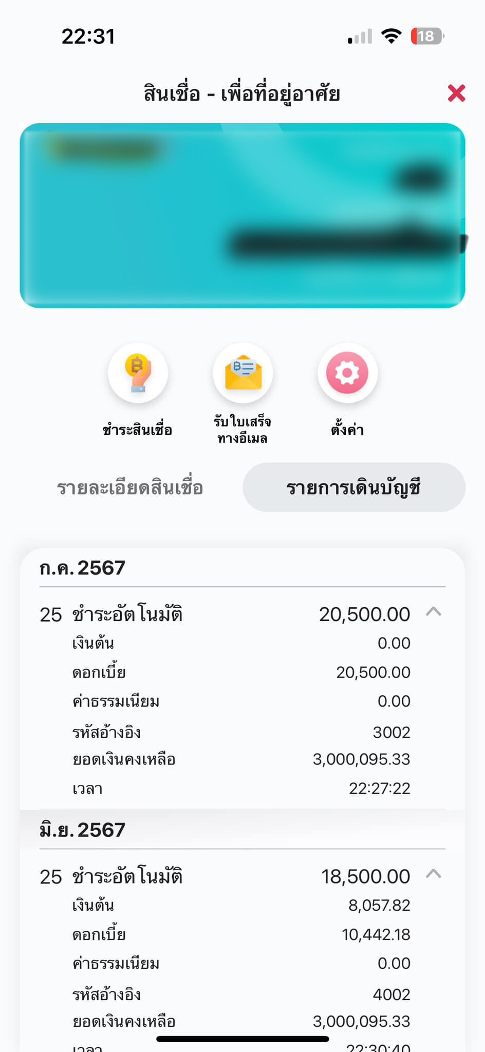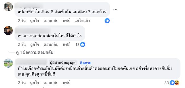 ผู้โพสต์ได้แนบบิลการชำระเงิน ในเดือน มิ.ย. และ ก.ค. โดยมีรายละเอียดระบุว่า เป็นการหักชำระอัตโนมัติ ในเดือนมิ.ย.ชำระไป 18,500 บาท เป็นเงินต้น 8,057 บาท และดอกเบี้ย 10,442 บาท แต่เดือน ก.ค.ชำระ 20,500 บาท เป็นดอกเบี้ย 20,500 บาททำให้กลายเป็นสาเหตุของความข้องใจครั้งนี้