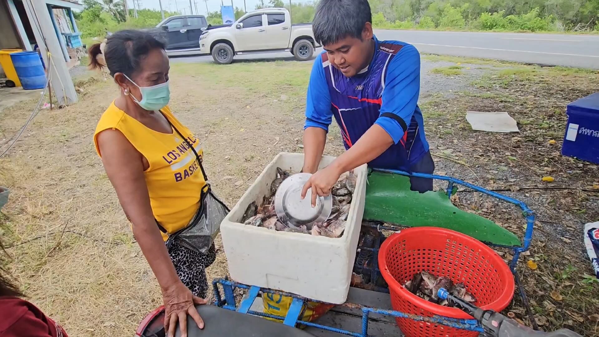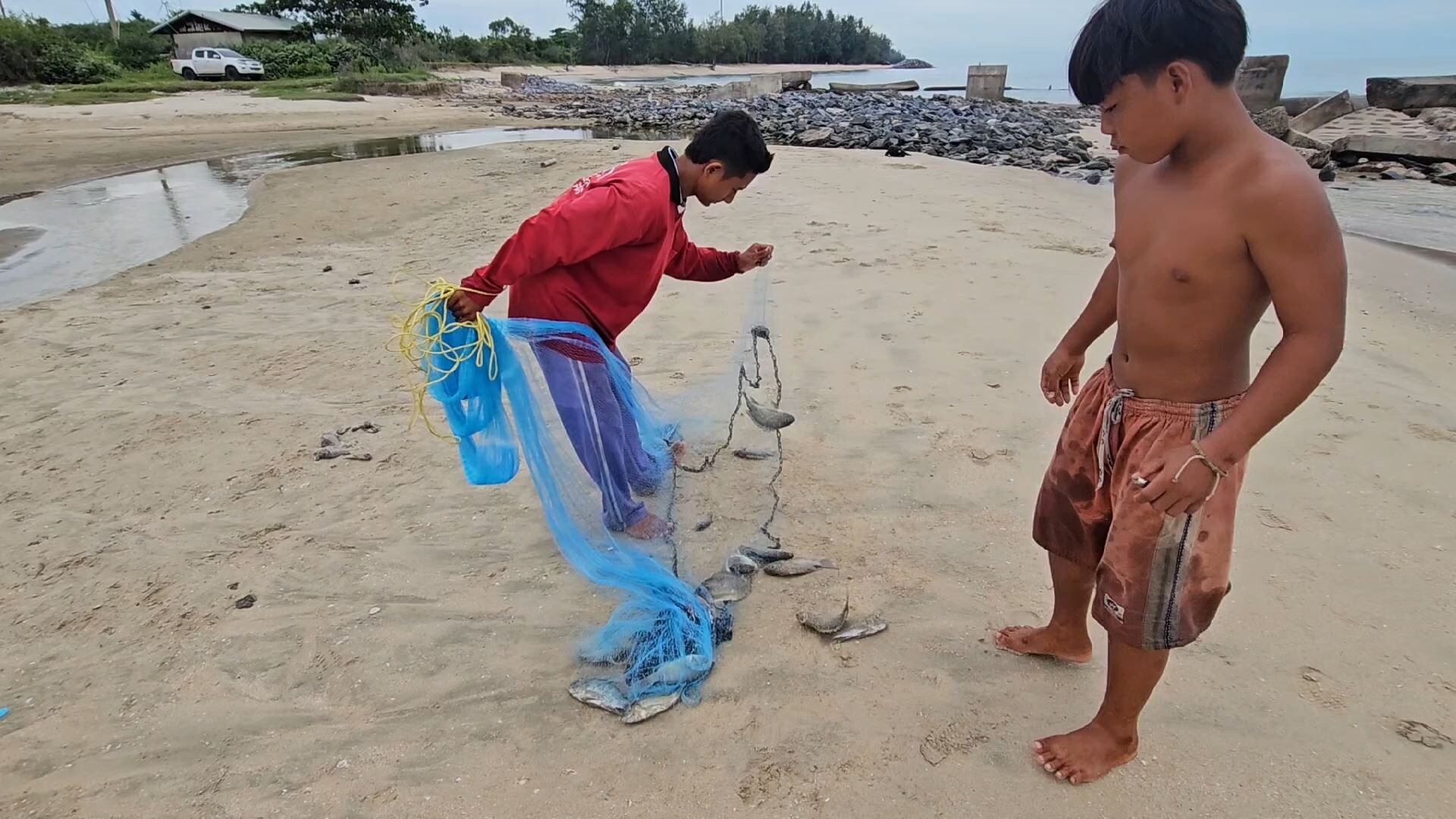ส่วนภายในฟาร์มที่บ่อน้ำทิ้งไม่ให้เข้าไปหาปลา แต่เมื่อเขาปล่อยออกมาอยู่นอกฟาร์มแล้ว คงไม่ห้าม ซึ่งได้ไปเก็บปลาทั้งคืน ซึ่งทอดแหอยู่หน้าท่อริมทะเลได้เป็นจำนวนมาก จึงใช้โอกาสนี้จับมาส่งยังจุดรับซื้อ