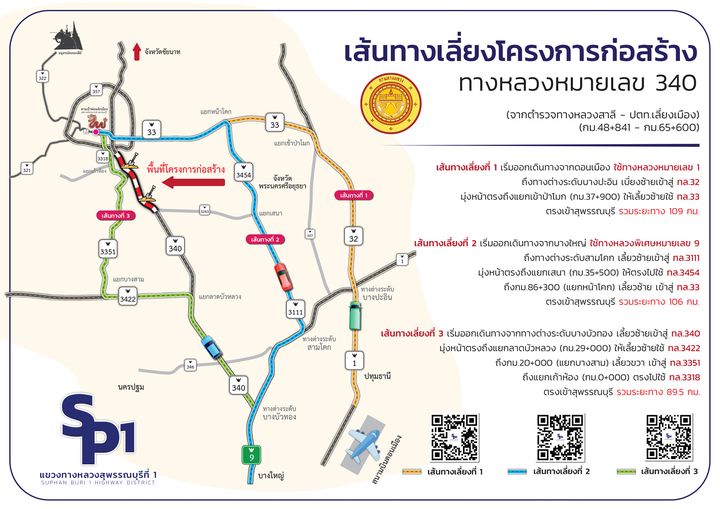 สำหรับเส้นทางเลี่ยงโครงการก่อสร้างทางหลวงหมายเลข 340 จากตำรวจทางหลวงสาลี-ปตท.เลี่ยงเมือง กม.48+841-กม. 65+600 เส้นทางเลี่ยงที่ 1 เริ่มจากเดินทางจากดอนเมือง ใช้เส้นทางหลวงหมายเลข 1 ถึงทางต่างระดับบางปะอิน เบี่ยงซ้ายเข้าสู่ ทล.32 มุ่งหน้าตรงถึงแยกเข้าป่าโมก (กม. 37+900) ให้เลี้ยวซ้ายใช้ ทล. 33 ตรงเข้าสุพรรณบุรี รวมระยะทาง 109 กม. ทั้งนี้ จะเริ่มปิดถนนในวันที่ 10 ตุลาคม 2567 ถึงปี 2570