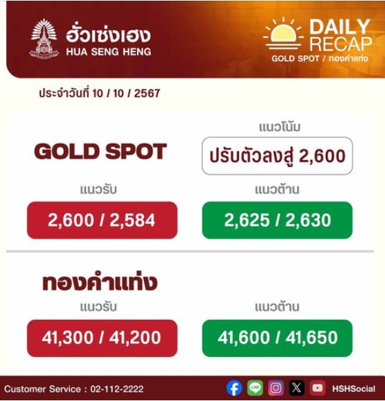 วันที่ 10 ตุลาคม 2567 ผู้สื่อข่าวรายงานว่า ฮั่วเซ่งเฮง วิเคราะห์แนวโน้มราคาทองคำประจำวันที่ 10 ตุลาคม 2567 ว่ามีแนวโน้ม “ปรับตัวลงสู่ 2,600 ดอลลาร์สหรัฐต่อออนซ์” โดยให้แนวรับที่ 2,600/2,584 ดอลลาร์ต่อออนซ์ แนวต้านที่ 2,625/2,630 ดอลลาร์ต่อออนซ์ ส่วนทองคำแท่งให้แนวรับที่ 41,300/41,200 บาท แนวต้านที่ 41,600/41,650 บาท