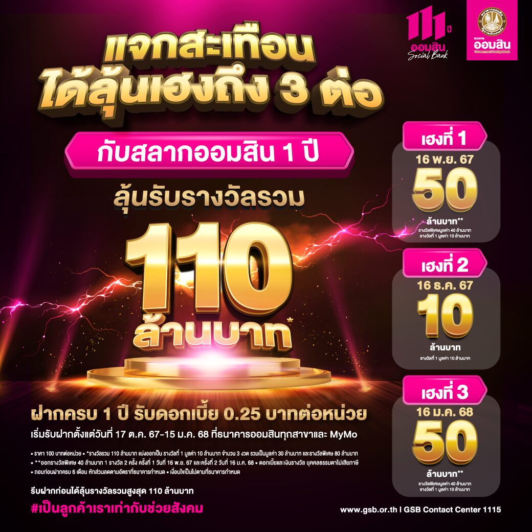 ออมสิน เปิดแคมเปญยักษ์ สลาก 1 ปี ลุ้น 3 ต่อ รางวัลรวม 110 ล้านบาท
