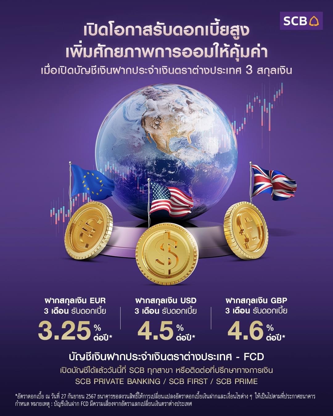 เริ่มจาก “ธนาคารไทยพาณิชย์” เปิดโอกาสรับดอกเบี้ยสูงสุด 4.60% ต่อปี เพิ่มศักยภาพการออมให้คุ้มค่า เมื่อเปิดบัญชีเงินฝากเงินตราต่างประเทศ (FCD) ประเภทเงินฝากประจำ 3 สกุลเงิน จะฝากสกุลเงินใด ก็รับดอกเบี้ยสูง