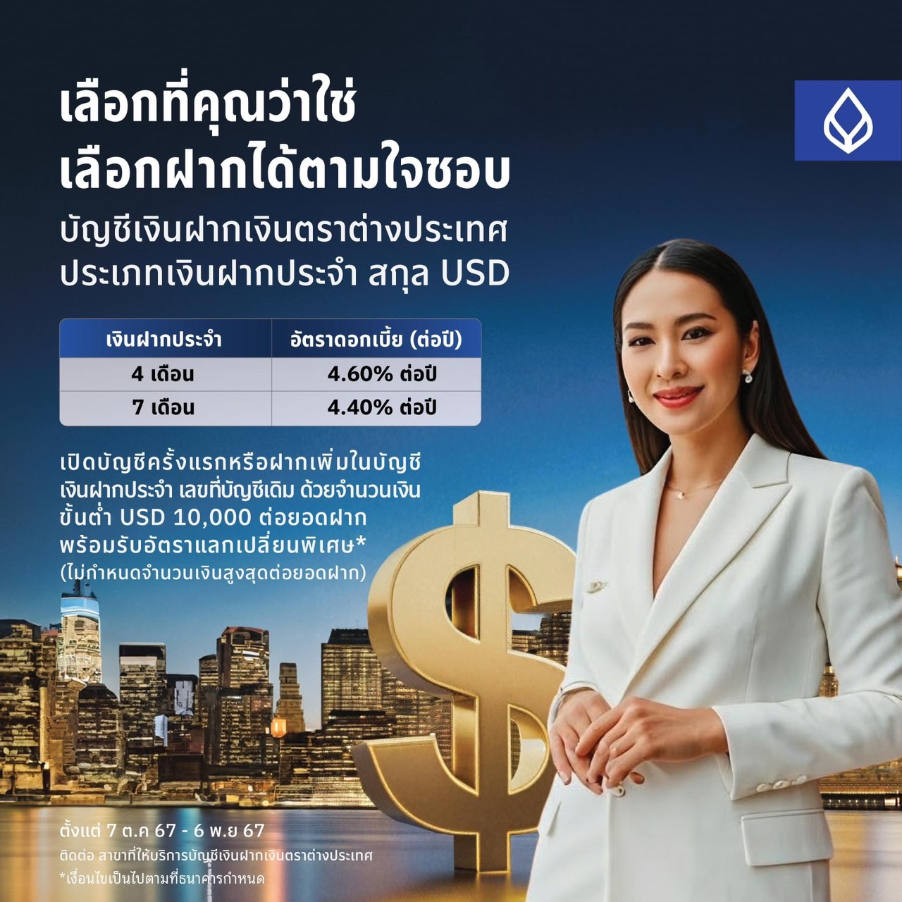ฝากประจำ 4 เดือน สกุลเงิน USD อัตราดอกเบี้ย 4.6% ต่อปี