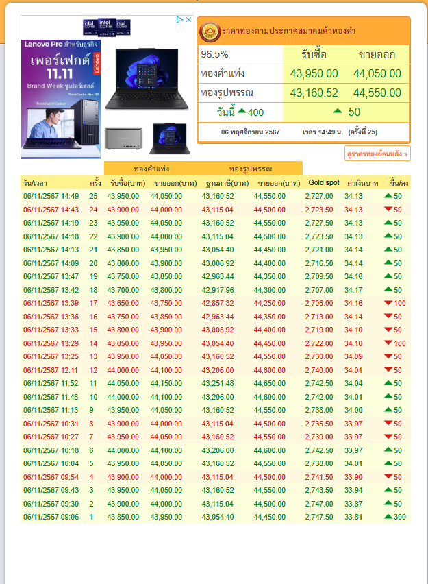 โดยการปรับขึ้นลงในวันนี้แบ่งเป็นปรับขึ้นรวม 15 ครั้ง และปรับลง 10 ครั้ง ส่งผลให้ ณ เวลา 15.00 น. ราคาทองคำในประเทศปรับเพิ่มขึ้นรวม 400 บาท โดยราคาทองคำแท่งขายออกอยู่ที่ 44,050 บาท และทองรูปพรรณขายออกอยู่ที่ 44,550 บาท