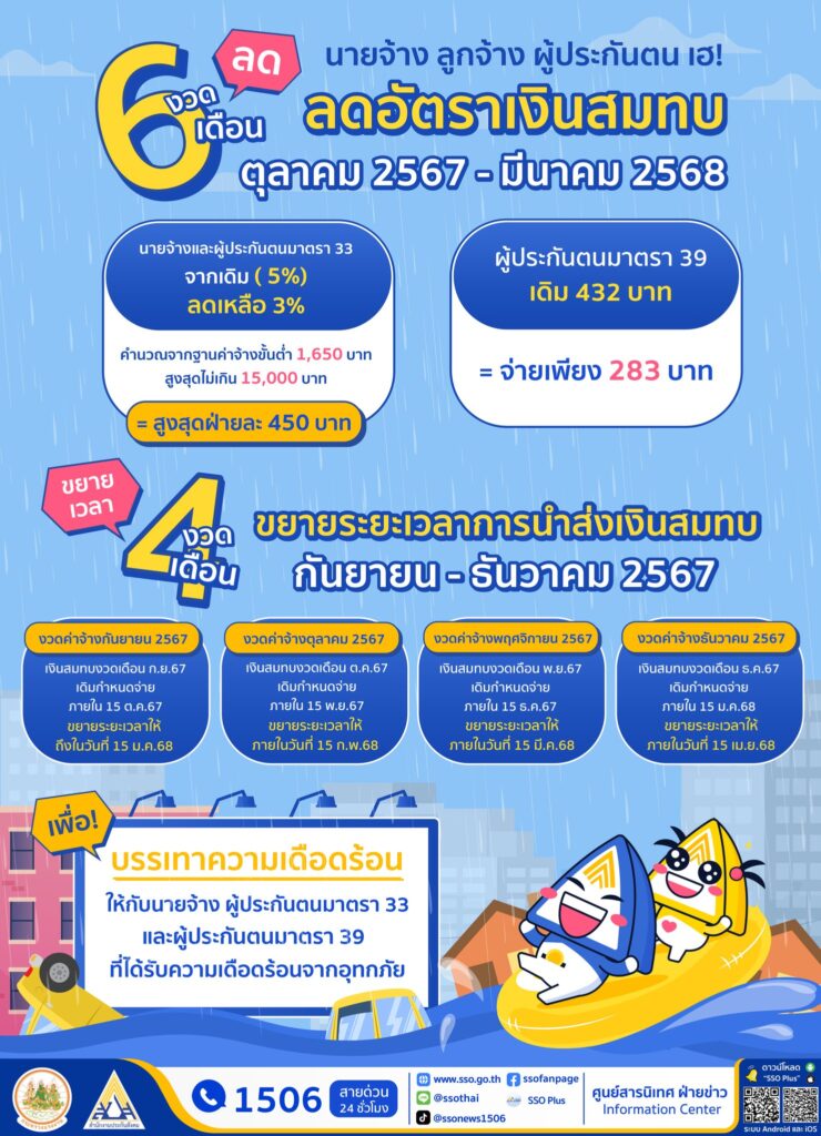1. ลดอัตราเงินสมทบ ช่วงระยะเวลา 6 งวดเดือน ตั้งแต่เดือนตุลาคม 2567 – มีนาคม 2568 รายละเอียดดังนี้