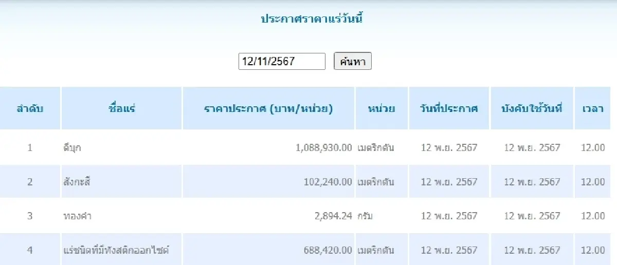 ประกาศราคาแร่ (กรมอุตสาหกรรมพื้นฐานและการเหมืองแร่) เรื่อง กำหนดราคาเพื่อใช้เป็นเกณฑ์ประเมิน สำหรับเรียกเก็บค่าภาคหลวงแร่ ประจำวันที่ 12 พฤศจิกายน 2567