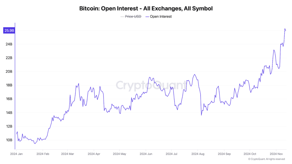 ปริมาณสัญญาซื้อขายล่วงหน้าของ Bitcoin พุ่งสูง (open interest) เป็นปัจจัยสำคัญที่อาจขัดขวางไม่ให้ราคา Bitcoin พุ่งแตะระดับ 90,000 ดอลลาร์ในระยะสั้น ตามข้อมูลจาก CryptoQuant แสดงให้เห็นว่า ในสัปดาห์ที่ผ่านมา ตลาดฟิวเจอร์ส มีสัญญาเปิด (open positions) เพิ่มขึ้นกว่า 16,000 ล้านดอลลาร์ ส่งผลให้ความสนใจopen interest ของ BTC อยู่ที่ 25,000 ล้านดอลลาร์ ซึ่งสูงที่สุดนับตั้งแต่เดือนสิงหาคม 2022 แม้จะเป็นสัญญาณบวกในช่วงราคาขาขึ้น แต่หากราคาเพิ่มขึ้นเร็วเกินไป อาจนำไปสู่ความไม่มั่นคงได้