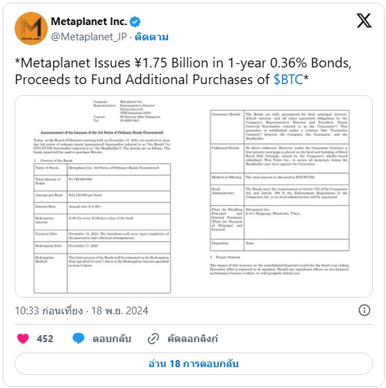 Metaplanet ได้โพสต์ข้อความผ่านแพลตฟอร์มโซเชียลมีเดีย X โดยระบุว่า บริษัทจะออกพันธบัตรสามัญระยะเวลา 1 ปี มูลค่ารวม 1.75 พันล้านเยน (ประมาณ 11.3 ล้านดอลลาร์) โดยเสนออัตราดอกเบี้ย 0.36% ต่อปี รายได้จากการระดมทุนครั้งนี้จะถูกนำไปใช้สำหรับการซื้อ Bitcoin ทั้งหมด เพื่อเสริมพอร์ตการลงทุนของบริษัทให้แข็งแกร่งยิ่งขึ้น