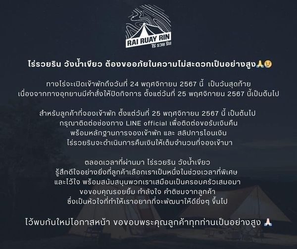 ออกมาโพสต์ภาพ ผ่าน Tiktok “rairuayrin” แจ้งข่าวร้ายให้กับนักท่องเที่ยวสายตั้งแคมป์ ได้ทราบว่า ตั้งแต่วันที่ 25 พฤศจิกายน 2567 ทางไร่ต้องปิดกิจการในทันทีตามคำสั่งของอุทยาน