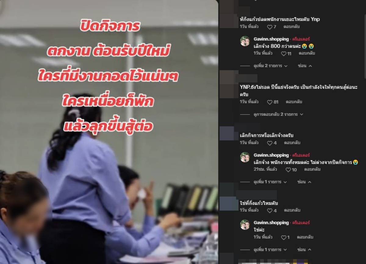 นอกจากคอมเมนต์ที่มีทั้งสอบถามและให้กำลังใจพนักงานแล้ว ผู้ใช้ติ๊กตอกบางรายยังเข้ามาสอบถามกรณีดังล่าวบริษัทเลิกกิจการหรือเลิกจ้าง ? ซึ่งทางเจ้าของเรื่องเข้ามาตอบสั้น ๆ ว่า “เลิกจ้าง พนักงานทั้งหมดค่ะ ไม่ต่างจากปิดกิจการ”