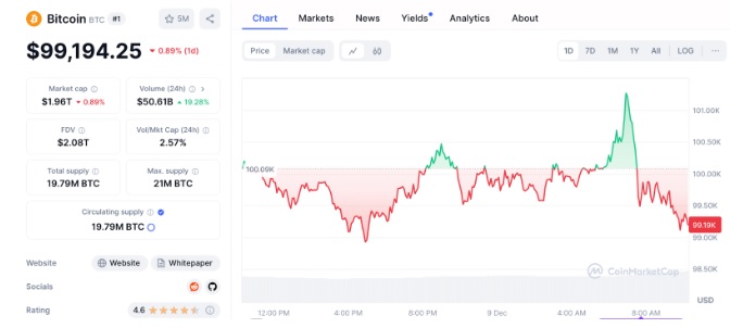 ในขณะที่รายงาน ราคา Bitcoin กำลังซื้อขายอยู่ที่ 99,194 ดอลลาร์ ลดลง 0.89 % ภายใน 24 ชั่วโมง อ้างอิงข้อมูลจาก coinmarketcap
