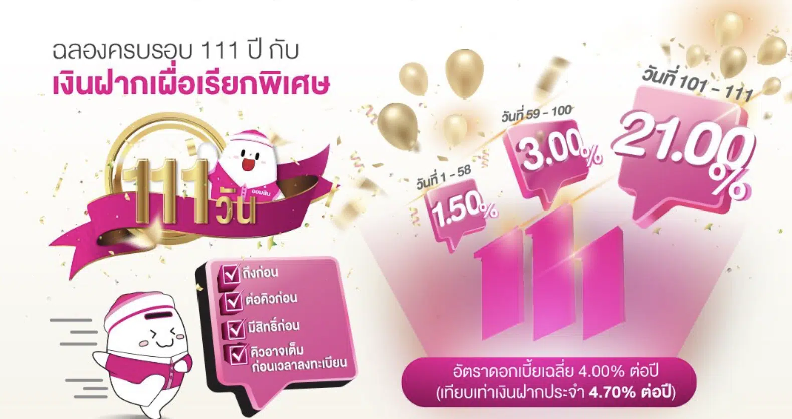 ออมสินจัดหนัก ดึงดูดเงินฝาก ดอกเบี้ยสูง 4% ต่อปี กับโปรฯ เผื่อเรียกพิเศษ 111 วัน