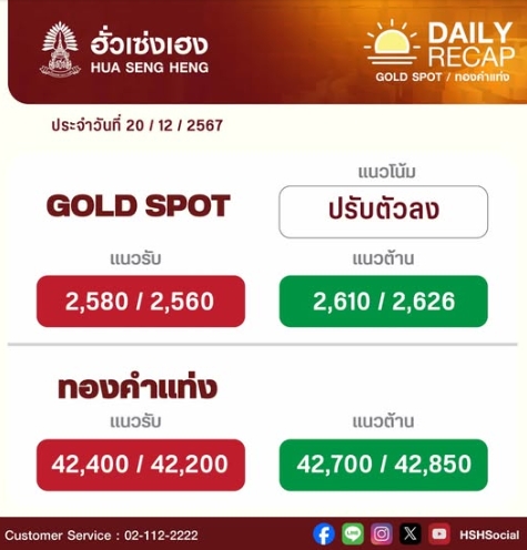 ทั้งนี้ ฮั่วเซ่งเฮงให้แนวโน้มทองคำปรับตัวลง แนวรับที่ 2,580 / 2,560 ดอลลาร์ แนวต้านที่ 2,610 / 2,626 ดอลลาร์ ส่วนทองคำแท่ง ให้แนวรับที่ 42,400 / 42,200 บาท แนวต้านที่ 42,700 / 42,850 บาท
