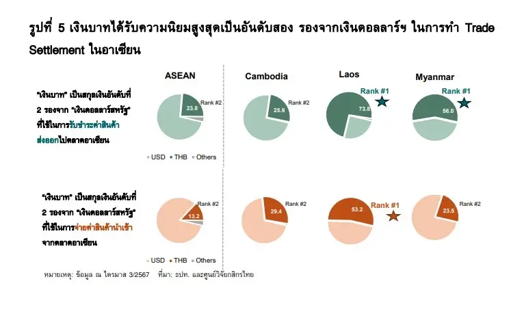 ไทยเก่งอะไร? จากสายตาของต่างชาติ ไทยถูกมองว่ามีจุดแข็งหลายด้าน โดยในมิติของการค้าภายในอาเซียน เงินบาทเป็นสกุลเงินที่ได้รับความนิยมมากที่สุด รองจากสกุลเงินดอลลาร์ฯ ในการรับชำระค่าสินค้าส่งออก และจ่ายเป็นค่าสินค้านำเข้า กับคู่ค้าในตลาดอาเซียน โดยเฉพาะการค้ากับกัมพูชา สปป. ลาว และเมียนมาร์ (รูปที่ 5)