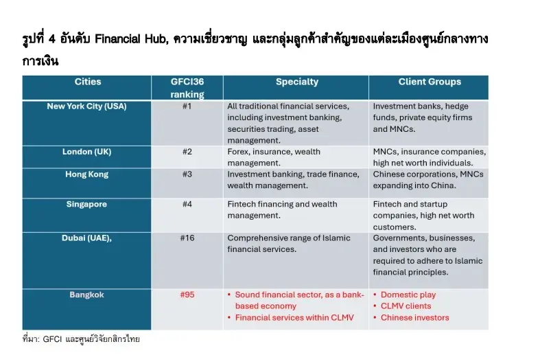 อย่างเช่น นิวยอร์ก (อันดับ 1) ลอนดอน (2) ฮ่องกง (3) สิงคโปร์ (4) หรือดูไบ (16) จะพบว่าอันดับของไทยยังทิ้งห่างอยู่มาก เนื่องจากเมืองศูนย์กลางทางการเงินอันดับต้น ๆ เหล่านั้น ได้รับการออกแบบกฎกติกา เกณฑ์ด้านภาษี และโครงสร้างพื้นฐานทางการเงินของประเทศ ที่พร้อมสนับสนุนการเคลื่อนย้ายเงินทุนและการระดมทุนอย่างมาก