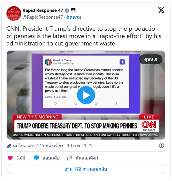 ความเคลื่อนไหวดังกล่าวของทรัมป์ บ่งชี้ความพยายามล่าสุดของผู้นำสหรัฐ ในการพยายามควบคุมและลดค่าใช้จ่ายของส่วนกลาง แต่หากต้องมีการยุติการใช้เหรียญ 1 เซนต์เป็นการถาวร เรื่องนี้ต้องผ่านความเห็นชอบของสภาคองเกรสด้วย.