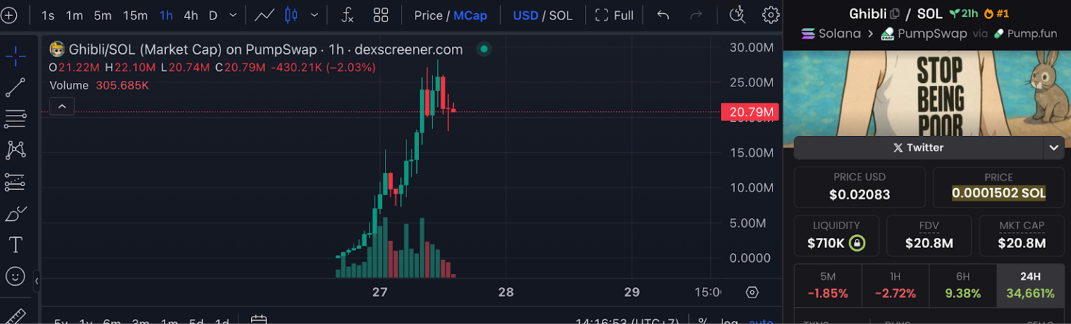 อ้างอิงข้อมูลจาก Dexscreener ผลปรากฏว่า ในวันนี้ได้มีเหรียญมีมธีม Ghibli ถือกำเนิดขึ้นเป็นจำนวนมาก และได้รับความสนใจถึงขนาดติดชาร์ตยอดนิยมในหน้าหลักกันหลายโปรเจกต์