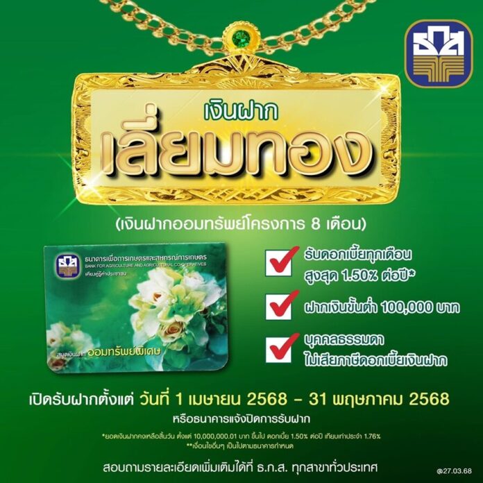 ธ.ก.ส. เปิดตัว เงินฝากเลี่ยมทอง รับดอกเบี้ยทุกเดือนสูงสุด 1.50% ต่อปี