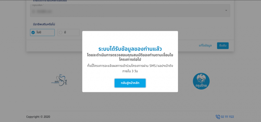 8. เสร็จแล้วจะขึ้นข้อความว่า "ระบบได้รับข้อมูลของท่านแล้ว โดยจะดำเนินการตรวจสอบคุณสมบัติของท่านตามเงื่อนไขโครงการต่อไป ทั้งนี้โครงการจะแจ้งผลการเข้าร่วมโครงการผ่าน SMS/แอปฯ เป๋าตัง ภายใน 3 วัน แล้วคลิกคำว่า "กลับสู่หน้าหลัก" เป็นอันเสร็จการลงทะเบียน